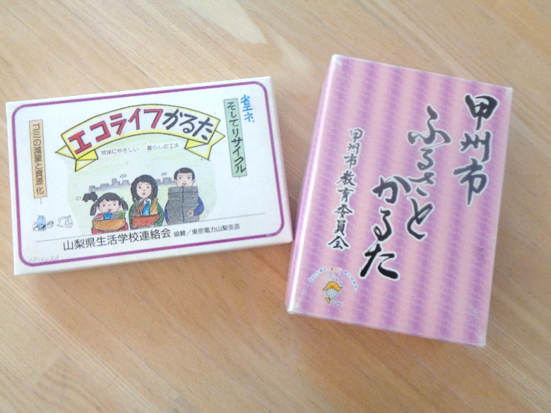 今回は、子どもたちと一緒に「エコライフかるた」と「甲州市ふるさとかるた」の2つのかるたで遊びました。
